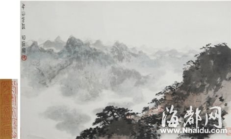 此幅《千山云起》为傅抱石1964年所作,画面以左右、远近和浓淡的对比方式展开,具有盈盈小尺幅言之不尽的张力。右侧近山呈阶梯式上扬,山体树木郁郁葱葱,亭台屋宇林立山间,游人三三两两徜徉于美景中;远处群山连绵起伏,云雾缭绕其间,伴着山脉延伸至无尽的远方。傅抱石惯于先将大结构以大气磅礴之势倾泻于画纸,然后再细致收拾,小心着墨,并以具有点睛效果的色彩加以点缀,效果非凡。