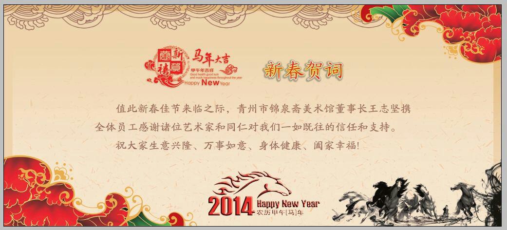 “一元复始山河美,万象更新锦绣春”,2014年来了,我们锦泉斋美术馆也迈入了新的一年。在此,锦泉斋全体工作人员祝福在2014年,能够与广大客户共同##、合作愉快,能够与许许多多的新老朋友携手共进、增进友谊。祝所有的新老朋友们在2014年,大展鸿图!事业有成!身体健康!家庭幸福!