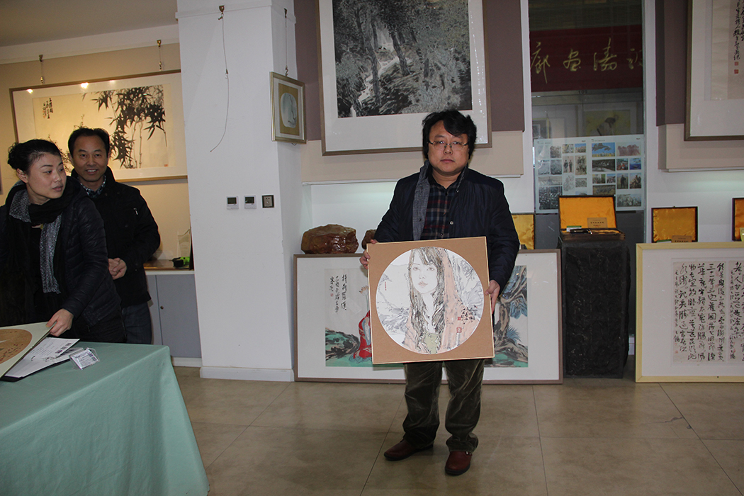 ##画家孙棋、崔景哲于2014年12月20日到锦泉斋参观,并与其作品合影